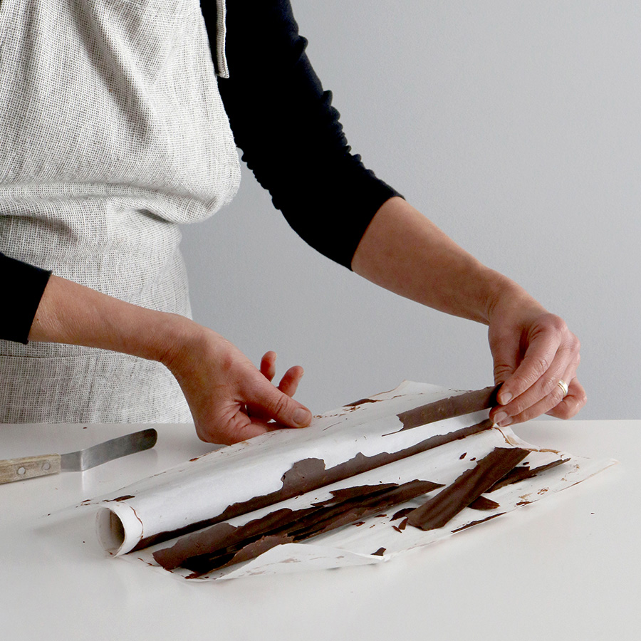 To use, unfurl the firmed chocolate and break-off the pieces. Decorate the Bûche de Noël by pressing the chocolate “bark” shards, horizontally, onto the room-temperature ganache.